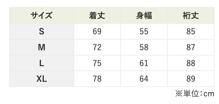 XLサイズ:着丈78 / 身幅63 / 肩幅53 / 袖丈68