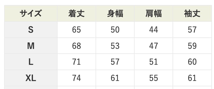 XLサイズ:着丈74 / 身幅61 / 肩幅55 / 袖丈61