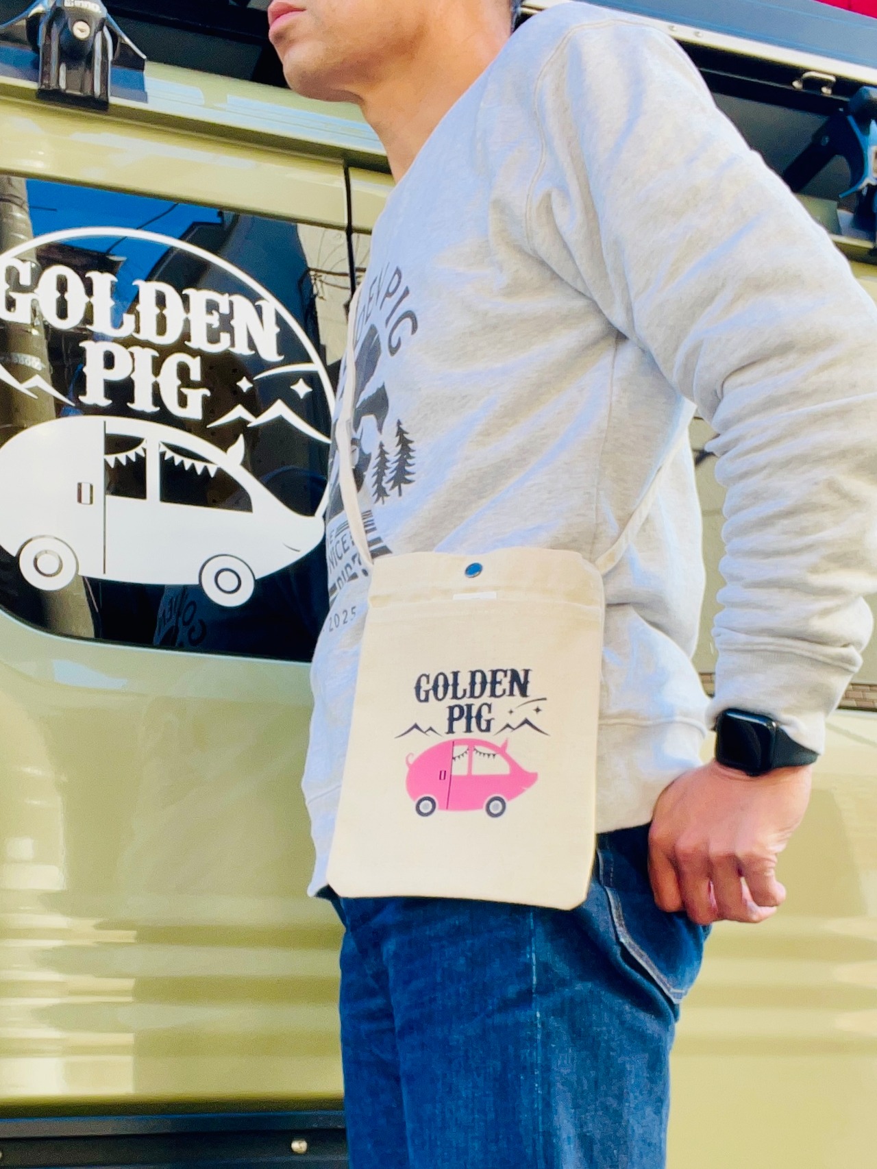 ロゴカラーには、ブランドのアイコンである「ブタさん」をイメージした、優しく温かみのあるピーチピンクをセレクトしました。ナチュラルのキャンバス地にパッと映えるこの色は、ゴールデンピッグのオリジナル。性別を問わず、コーディネートのアクセントとして楽しんでいただける絶妙なトーンに仕上げています。